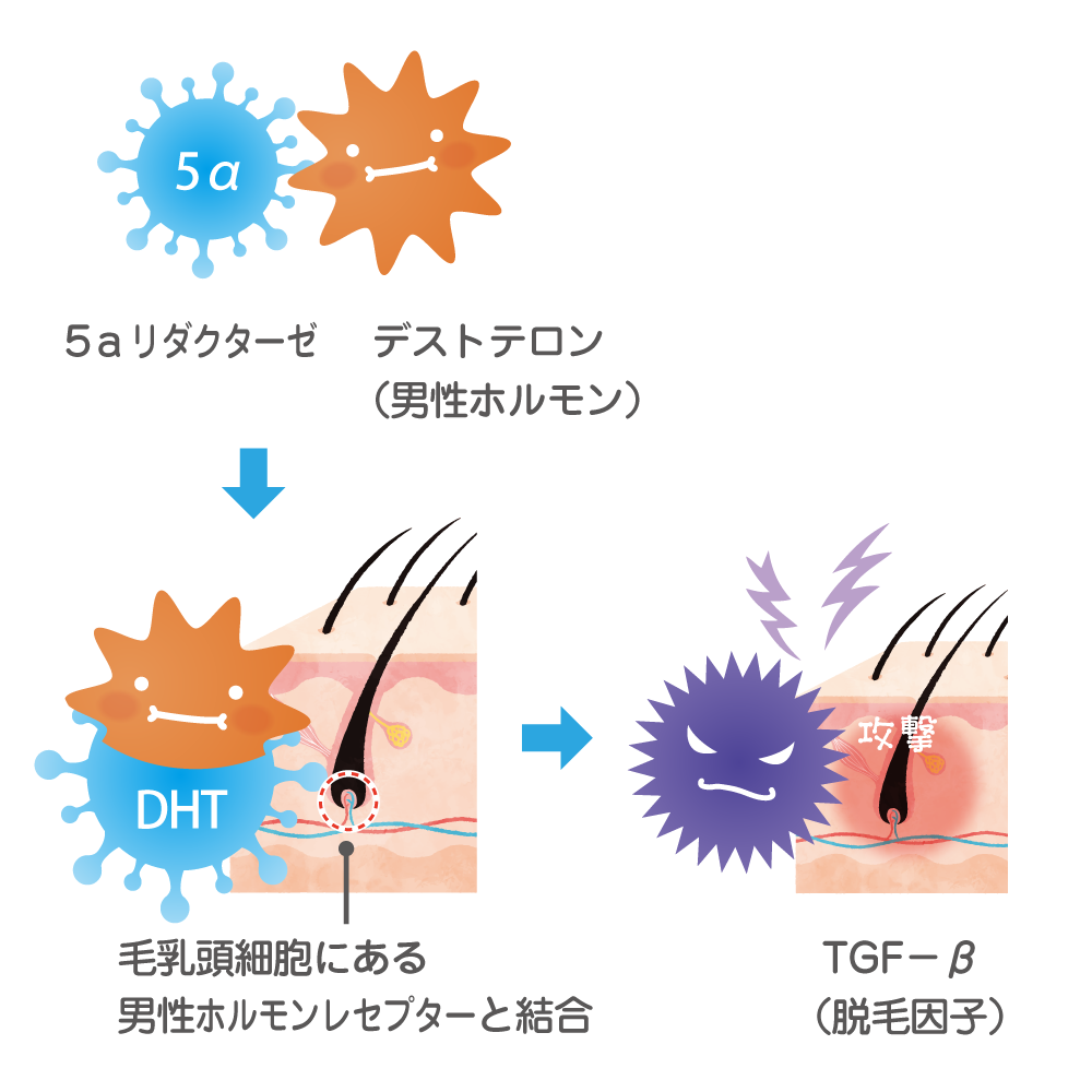 男性ホルモン「テストステロン」は頭皮の酵素5αリダクターゼによって「DHT(ジヒドロテストステロン)」に変わります。このDHTが毛根に作用すると成長を抑える物質(TGF-β)が増え、髪の成長期が短くなり、細く弱い髪が増えて抜けやすくなります。